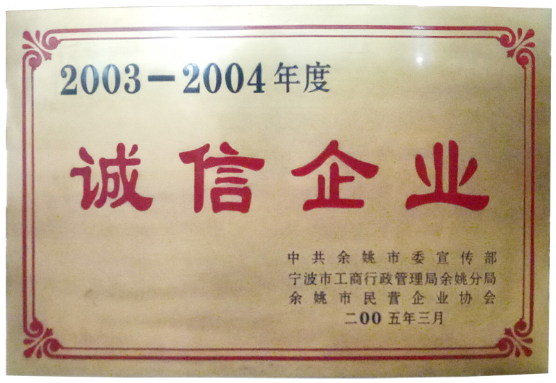 2005年3月,被中共余姚市委宣傳部、寧波市工商行政管理局余姚分局、余姚市民營(yíng)企業(yè)協(xié)會(huì)聯(lián)合評(píng)定為2003-2004年度“誠(chéng)信企業(yè)”