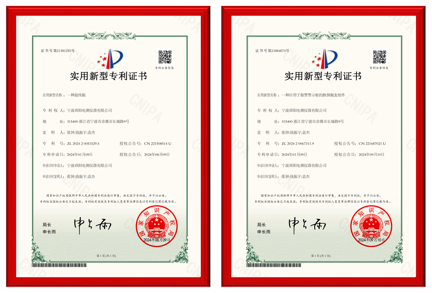 2024.10.28獲悉:我司申請的兩項(xiàng)實(shí)用新型專利均已審查通過,獲得國家知識(shí)產(chǎn)權(quán)局的授權(quán),它們是:一種應(yīng)用于報(bào)警警示樁的跌倒觸發(fā)組件,一種接線板.專利號(hào)分別為ZL2024 2 0067311.9、ZL 2024 2 0051529.5。加上今年5月獲得的一項(xiàng)發(fā)明專利,我司今年已獲得三項(xiàng)專利。